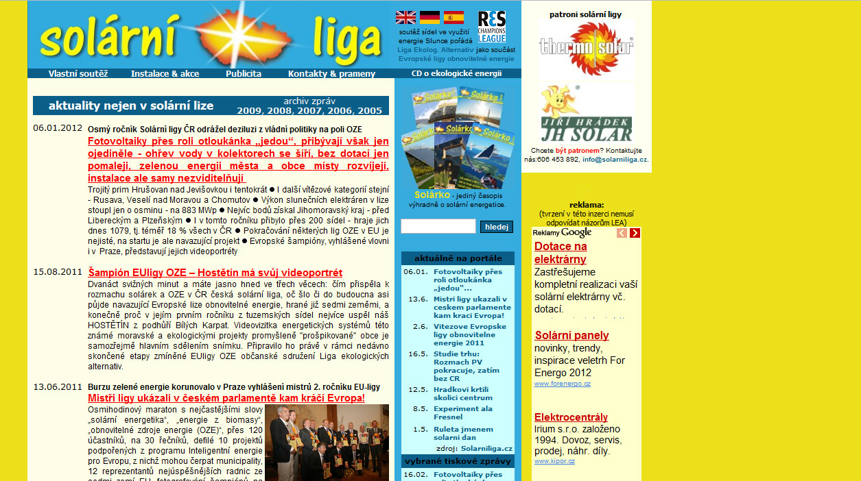 Solární liga jsou stránky plné solární energie jak pro ohřev, tak výrobu elektřiny. Seznam výrobců panelů, realizované projekty, dotace, vyhlášky.