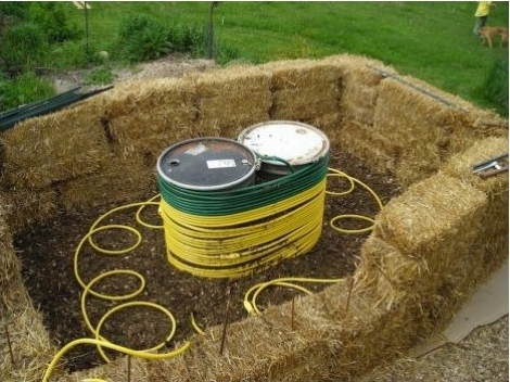 V principu jde o jednoduché zařízení, velký kompost vyhřívá vodu v hadicích a uprostřed nádrž s kejdou.